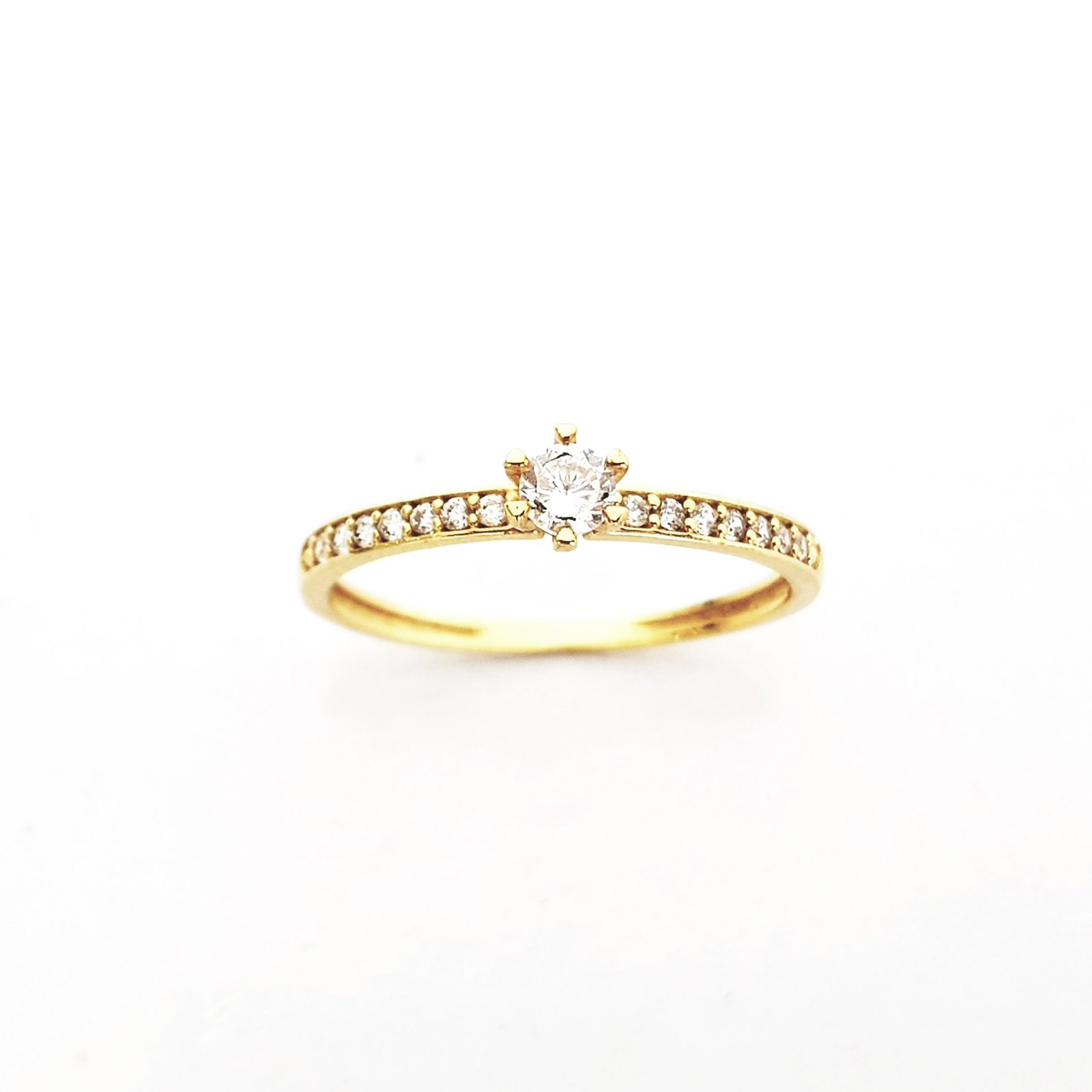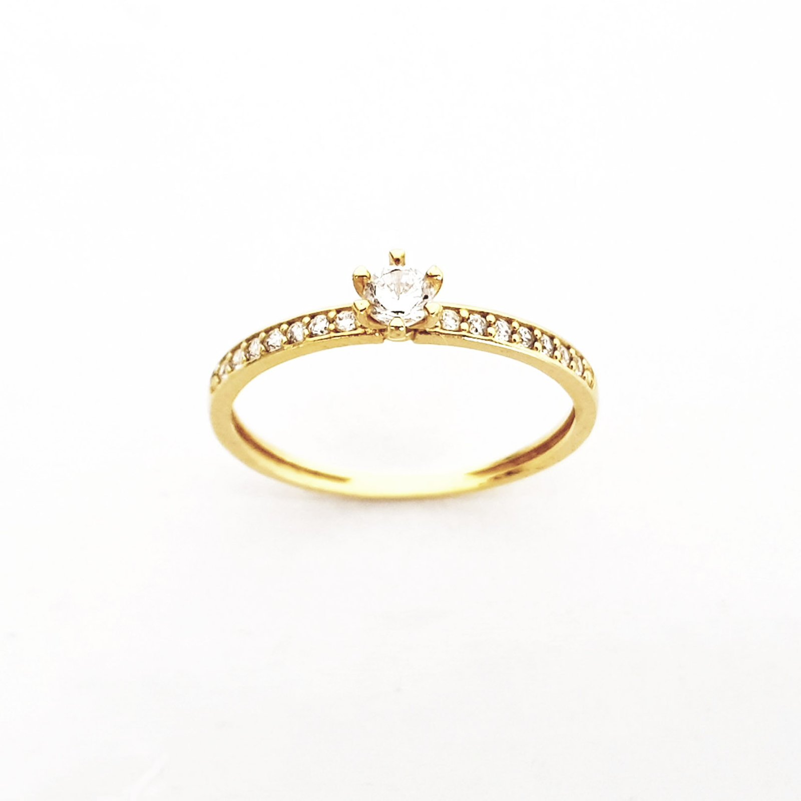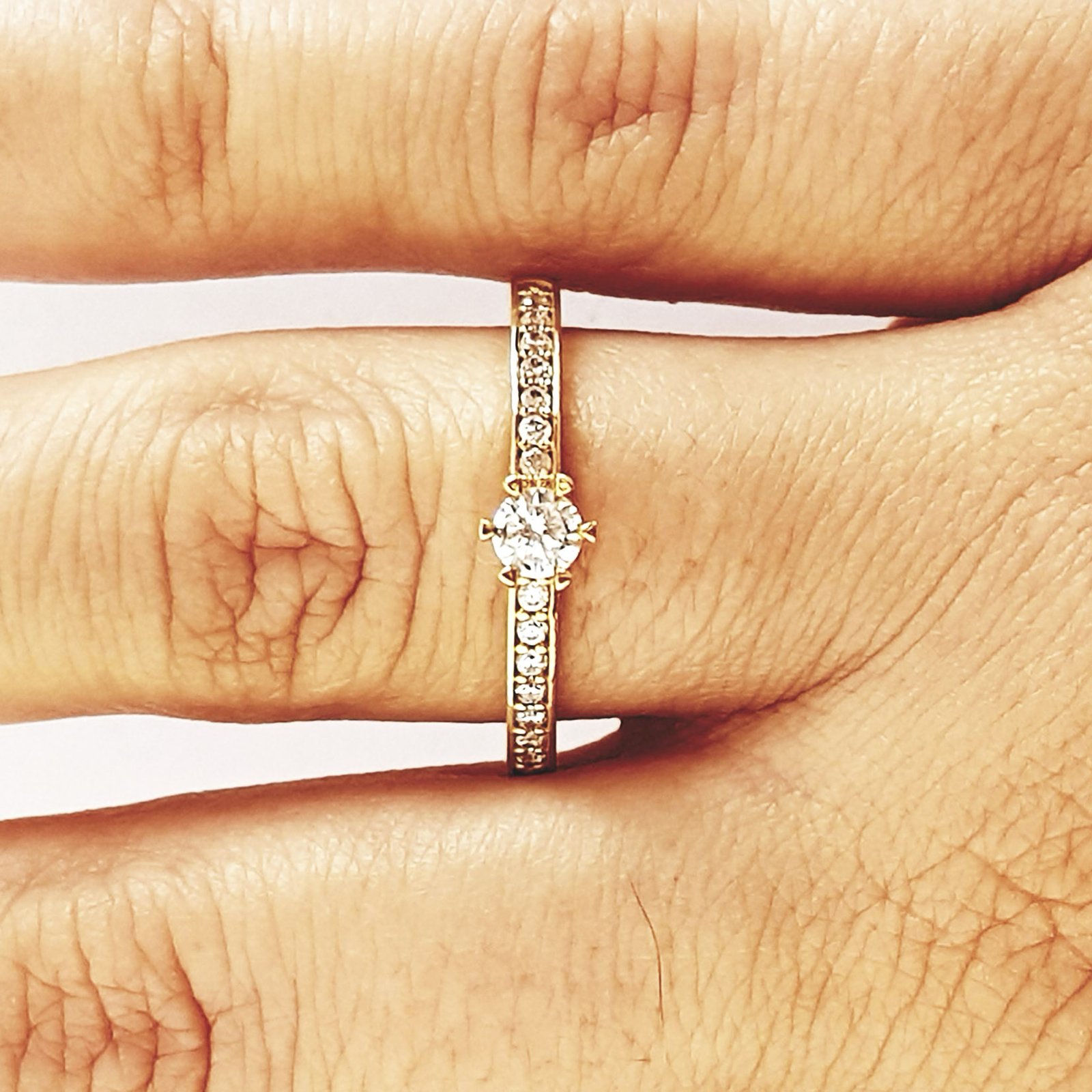 | Pedra | 01 diamante central de 3,40mm (15 pontos) e 14 diamantes laterais de 1,25mm (1,0 ponto) |